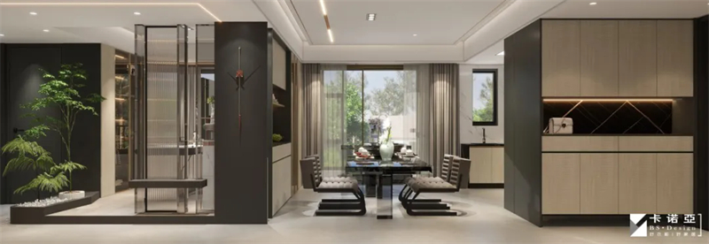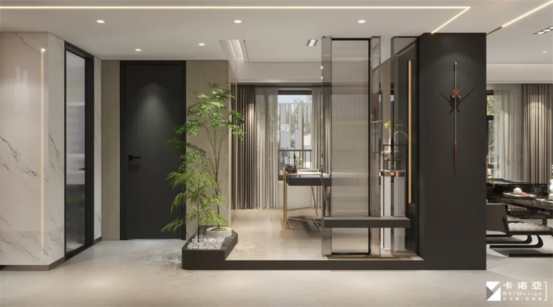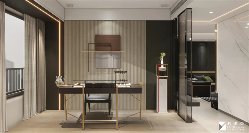 開放式書法室,以淡雅、寧靜色調為主,深色點綴,營造靜謐、專注的氛圍。材質上,選用格柵板、金屬、玻璃、大理石等跨界混搭,綠植點綴,既符合書法的自然氣息,又能提升室內的輕奢質感。
