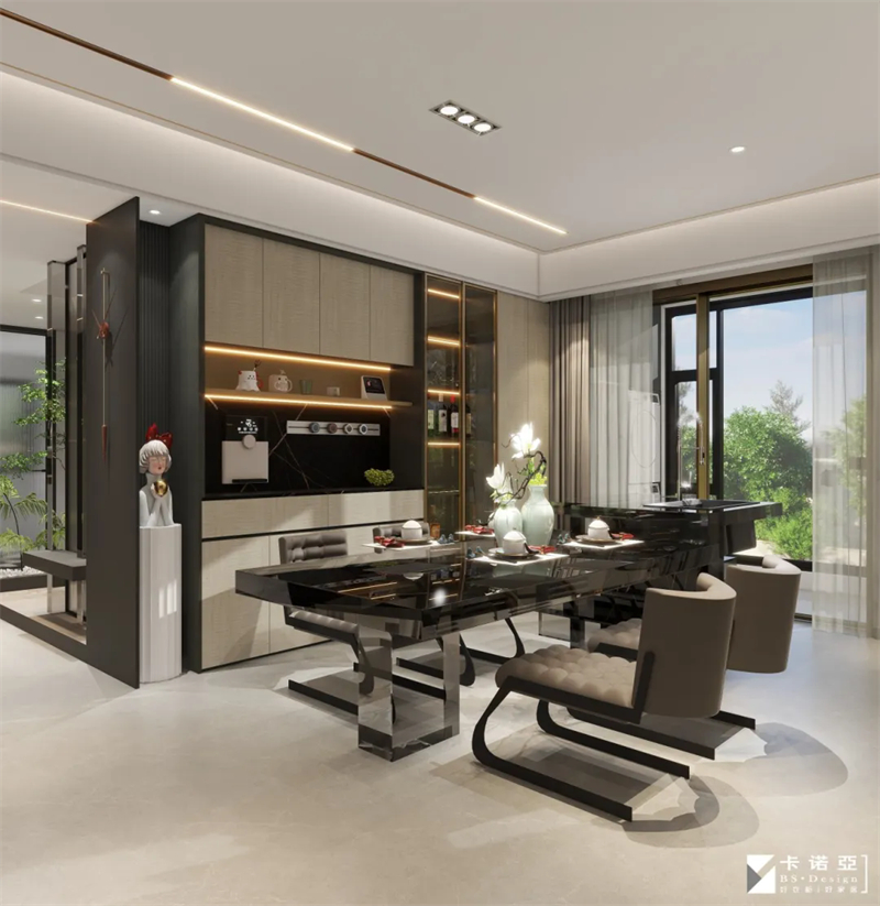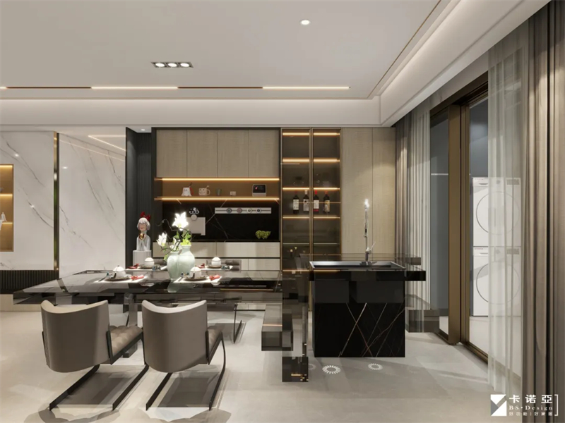 靠近餐桌的地方設置了餐酒櫃,色彩與全屋呼應,茶色玻璃櫃門通透可見,可以收藏香檳與紅酒、杯具,觥籌交錯,微醺生活,是E人聚會轟趴的好地方。