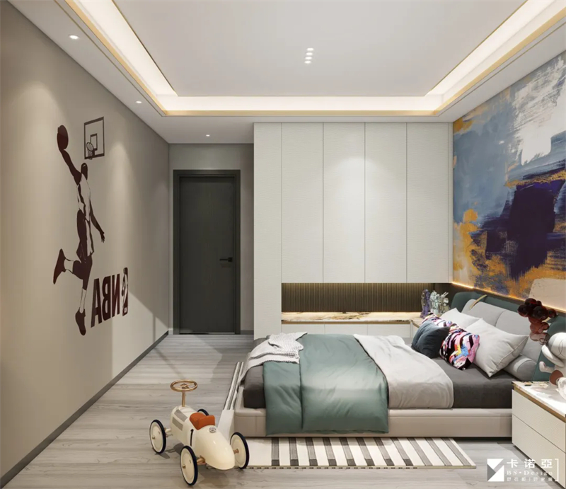 沿牆邊進行空間布局,打造學習區、休閑區和收納區,讓男孩擁有自己的私享天地。