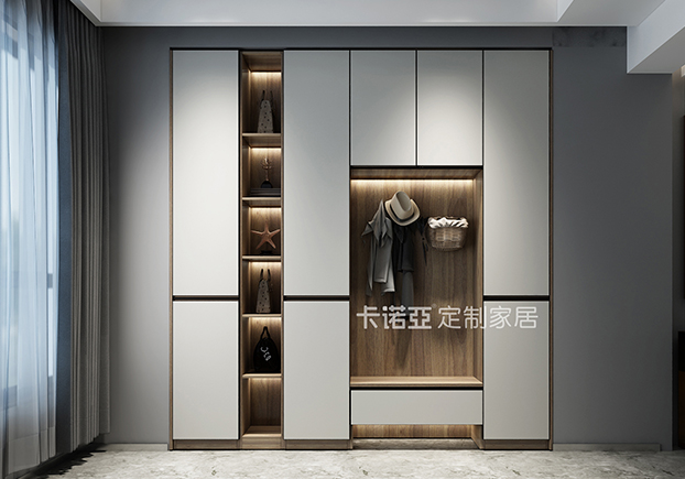 嵌入式玄關櫃,下麵是用木質板做成的換鞋凳,上麵再設計掛鉤,這樣實用功能和裝飾作用都大大增強。