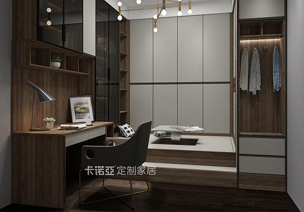 臥室比較沉穩大氣,玻璃門半開放式衣櫃黑白相間,空間空曠開放,有點極簡風。