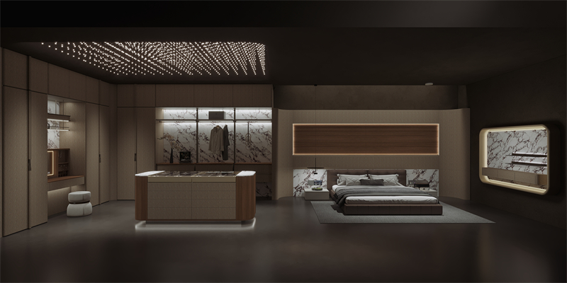 靈感源於“藏物之雅,玉之恒久”,藏玉係列以新中式為魂,通過“形、質、氣、韻、神”五重境界,打造步移景異的敘事空間。天然胡桃木皮與數碼打印石紋的碰撞,原創品牌LOGO拉手與倒R角工藝的巧妙結合,為35-55歲企業高管精英構建了一個禮序雅境。金屬雕刻衝孔板、格柵板勾勒光影韻律,透光彎曲板演繹虛實意境,在這樣的設計下,居者於歸家禮儀中重拾精神棲居的詩意。