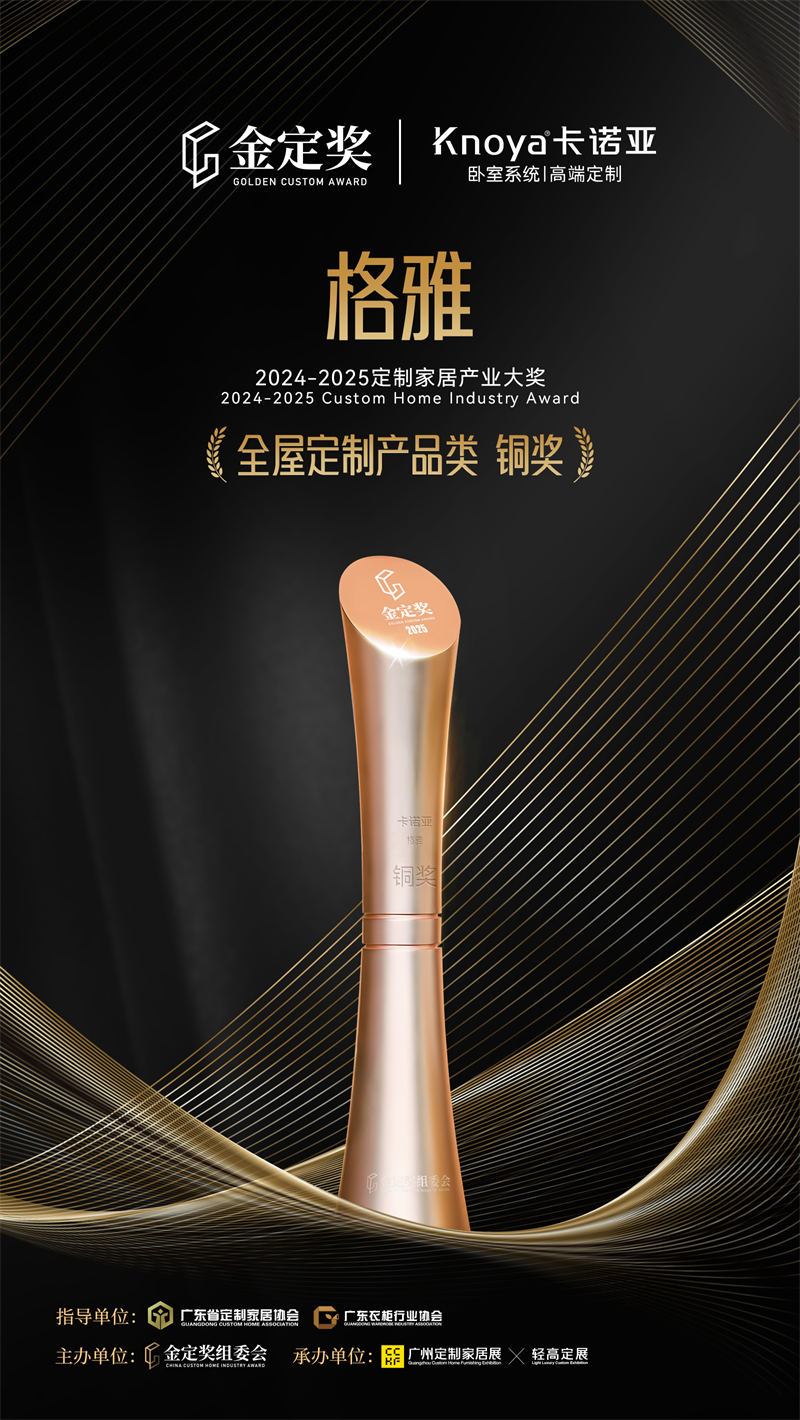 近日,金定獎2024-2025定製家居產業大獎頒獎典禮在廣州舉行。91看片软件下载雅致輕奢風格格雅係列產品,以差異化高端工藝、天然珍稀材質、原創設計語言和生活方式定製的設計邏輯,一舉獲得“金定獎全屋定製產品類·銅獎”,這不僅是中國家居產業對91看片软件下载創新實力的一致認可,更是行業對91看片软件下载深耕“臥室係統+整家定製”兩大品類的致敬。