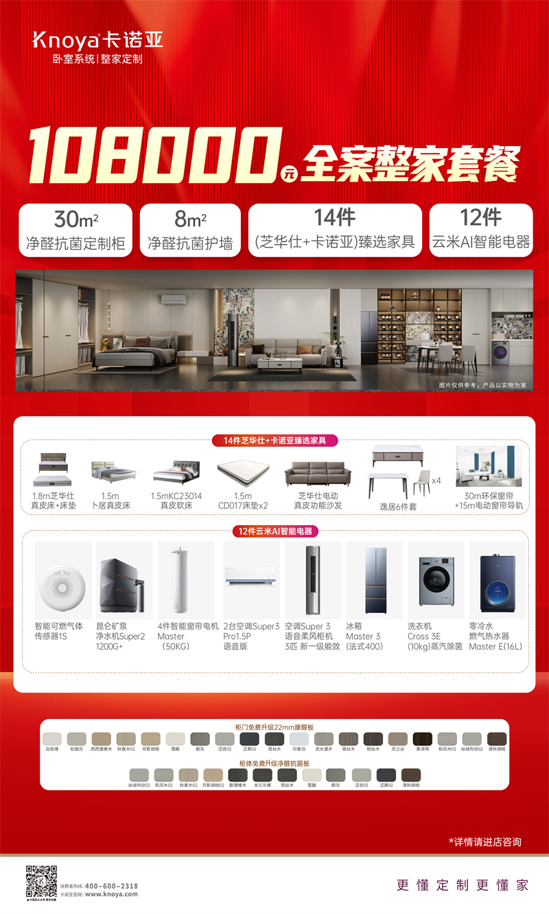 1、整家係統方案:以“櫃牆門一體”為核心,整合全屋定製櫃、櫥櫃、護牆板、室內門,並精選配套沙發、餐桌椅、茶幾、真皮床、床墊,提供係統性整家煥新方案,全屋同色係、同品質高端定製,風格渾然一體,輕鬆實現高顏值。