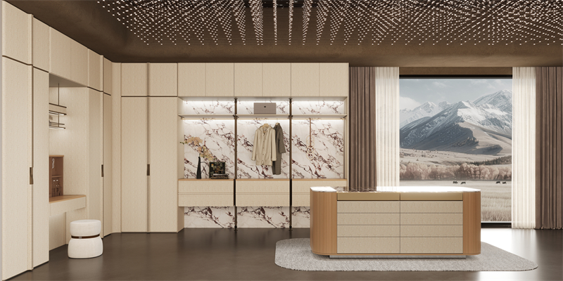 ·智能功能賦能:電動升降煙機、吊櫃電動升降機等智能配件,實現隱現自如的功能美學;立柱衣帽間係統自帶燈光,搭配西班牙蘭伯特收納五金,奢享收納儀式感。