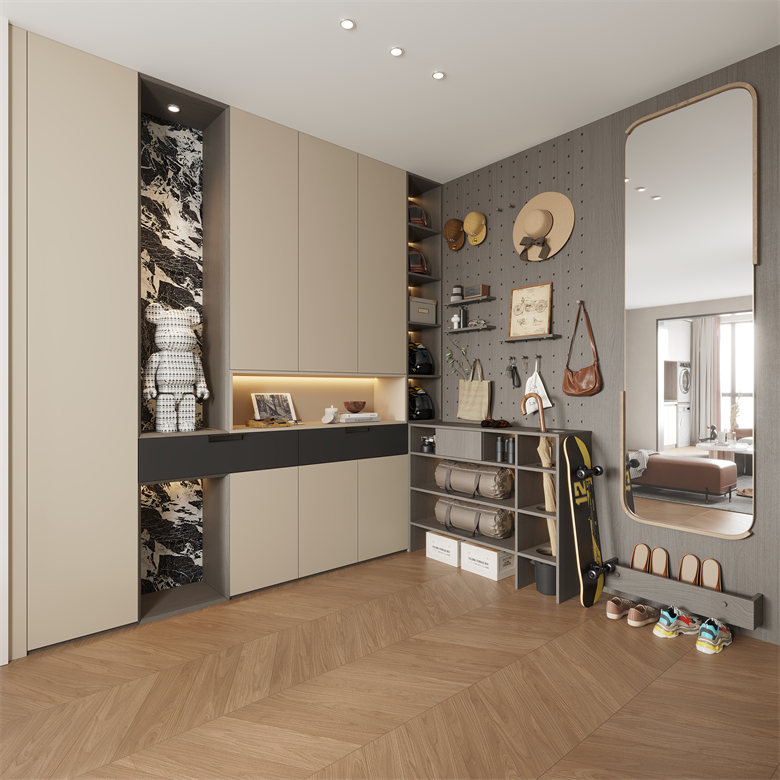 推開家門,迎麵而來的是精心設計的玄關空間。這裏不僅是收納功能區域,更是從喧囂都市回歸寧靜生活的過渡地帶。趣逸係列玄關以穿插式設計手法打造立體視覺層次,創意洞洞板讓收納兼具功能性與藝術感。