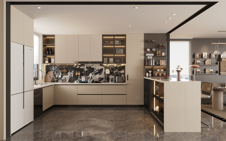 開放式餐廚設計是趣逸係列的亮點之一。小吧台的巧妙設置既可作為早餐角,也能變身為深夜小酌的浪漫空間。彌月UV膚感櫥櫃門板防指紋易清潔,內嵌式家電讓操作動線流暢合理。這裏既有現代手机看片网站的利落,又保留著家的溫度。