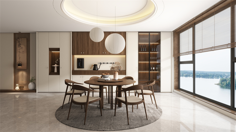 餐廳區域將古樸韻味與精妙結構融入室內。疊級設計營造視覺漸進,內斂卻不失格調;格柵抽屜設計精妙,以高定工藝打造含蓄的中式美感。圓形吊燈與天花板環形燈帶相呼應,柔和的燈光照亮整個用餐區。細膩木紋裝飾與現代簡潔的線條相融合,展現了禪意新中式的精致與內斂,在簡與繁、虛與實之間,構築出一個既能滿足現代生活需求,又能安放文人雅趣的餐飲空間。