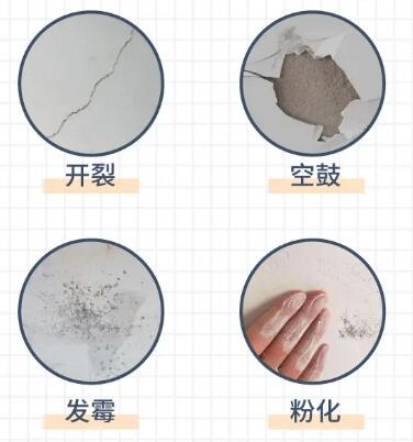 老房牆麵即使看起來沒什麽問題,也要驗明是否有開裂、空鼓、發黴、粉化等問題,如有,則必須全部鏟除,重新批灰、刷牆。