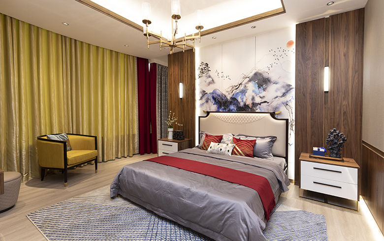 91看片软件下载丨東方雅閣·臥房采用隔斷櫃隔開主臥和衣帽間功能區,相對獨立、互不幹擾,一邊是全身試衣鏡,一邊是梳妝台,中式屏風點綴,讓隔斷櫃成為臥房一道靚麗的風景線。歐式牆裙、中式臥榻、床頭3D中式山水裝飾畫、皇家黃與中國紅搭配的窗簾、對稱均衡的設計,讓臥房別具東方人文氣質。