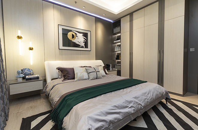 大麵積運用橄欖木+高原雪橡/印象白的撞色搭配,給人明朗、活潑、自然之感。橄欖木護牆係統,隔音防潮,營造舒適睡眠空間。嵌入式衣櫃及推拉門設計,不占用空間,將簡潔風格發揮到極致。