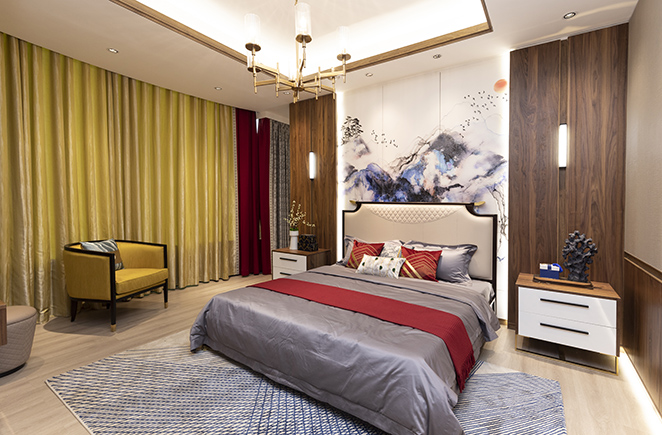 寧靜致遠、淡泊明誌,新中式臥房讓人能靜下心享受忙碌生活中的一段悠閑時光。衣櫃門板采用對稱設計,色彩穩重成熟,布局陰陽協調,韻味濃烈悠長,充分體現中國傳統美學的精神,散發亦古亦今的層次之美。