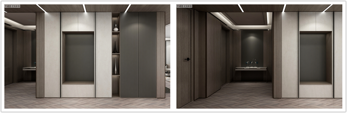 牆麵以木紋為基礎,搭配91看片软件下载“慕尼黑”凹凸格柵護牆板,豐富了空間的層次感。方正對稱的結構設計,櫃體牆麵一體化,視覺上整體統一。