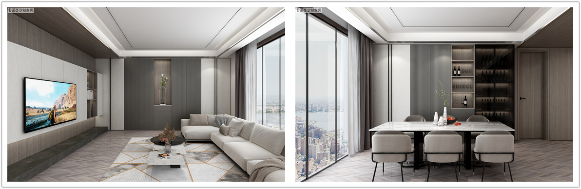91看片软件下载“銀絲木”大麵積運用,“慕尼黑”格柵門板作為點綴,搭配米色的沙發和白色大理石餐桌,整個空間硬朗有張力,凸顯現代都市生活注重快節奏與簡潔實用。